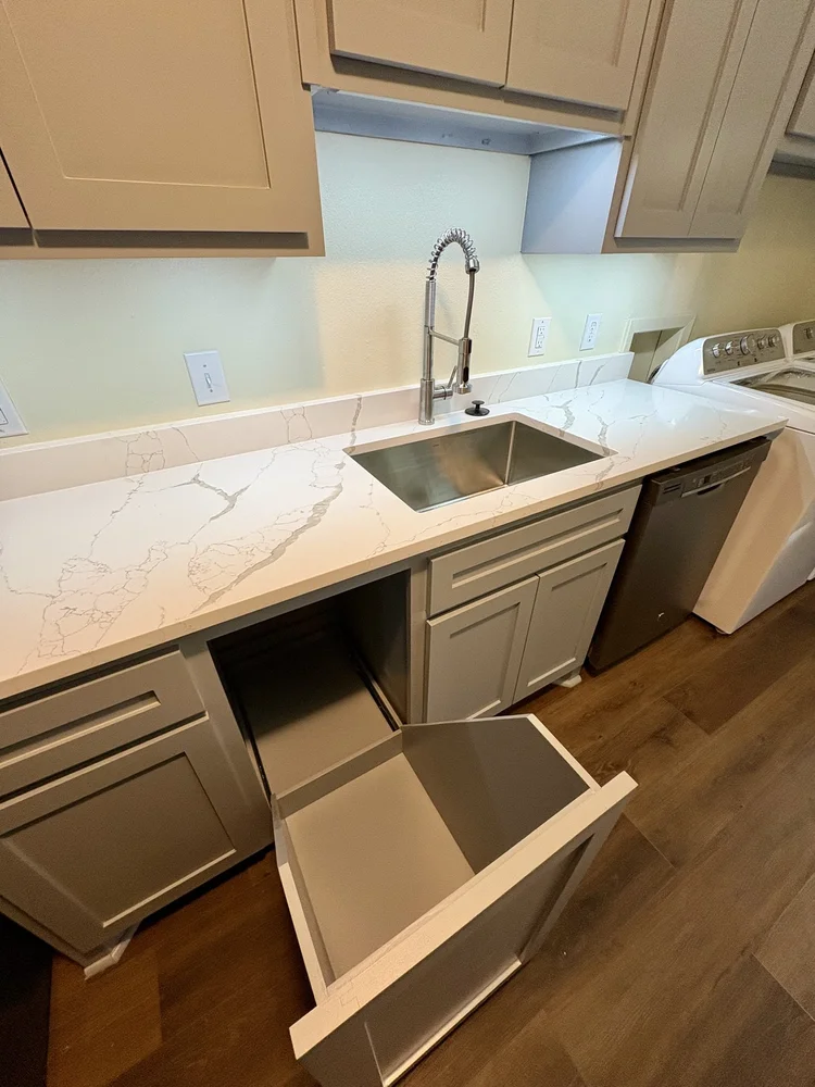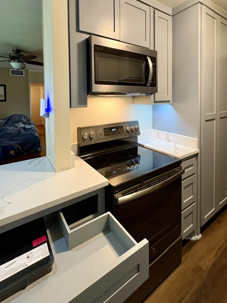 Ten27 Carpentry & Construction completed this kitchen renovation with a focus on both style and everyday functionality. The project included custom painted cabinets that refreshed the look of the kitchen and new countertops that provide a durable, polished surface for daily use.